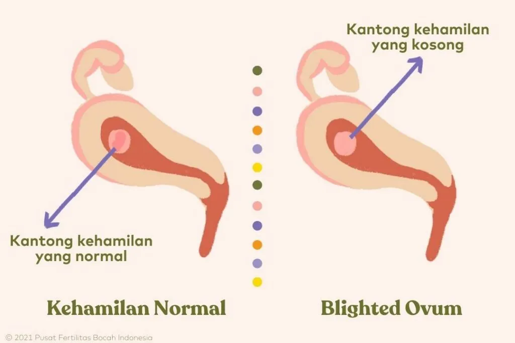 Kehamilan kosong, atau blighted ovum, terjadi ketika pembuahan sel telur dan sel sperma terjadi, tetapi hasil pembuahan tidak berkembang menjadi embrio. Hal ini bisa disebabkan oleh berbagai faktor, seperti: - Kelainan kromosom. - Kualitas sperma dan sel telur yang buruk. - Gangguan pembelahan sel. - Infeksi, seperti TORCH (Toxoplasmosis, Rubella, Herpes, HIV dan Sifilis). - Imunologi dan diabetes melitus yang tidak terkontrol. - Usia serta jumlah anak Ibu dan Ayah. - Kadar HCG (Human Chorionic Gonadotropin) yang rendah. - Kelainan pada rahim. - Efek samping obat-obatan. - Gangguan hormon seperti hormon progesterone.